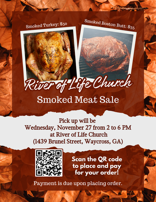 Thank you for your interest in purchasing smoked meats from River of Life Church! These will be available for pick-up at River of Life Church (1439 Brunel Street in Waycross) on Wednesday, November 26 from 2 to 6 PM.